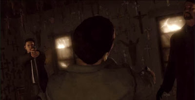 | I reacted to Nathaniel's sudden move after he surrendered and shot him. Turns out he was just pulling out a cross, and I regretted not keeping my cool. It's this scene.