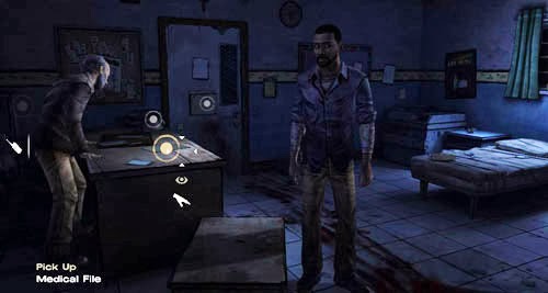 In TWD, the player uses the cursor with a mouse or the right stick. In HR, the player uses the right analog as an action button. Most areas in TWD allow you to just click on something across the field and have Lee walk over to it automatically. Since there is no pointer in HR, when you see something or someone you want to interact with, you walk over there yourself. In TWD, when multiple objects can be clicked on, you hover the cursor over the one you want and press the action button. In HR, multiple gestures appear corresponding to which side the object is on, and you flick the right stick towards it.
